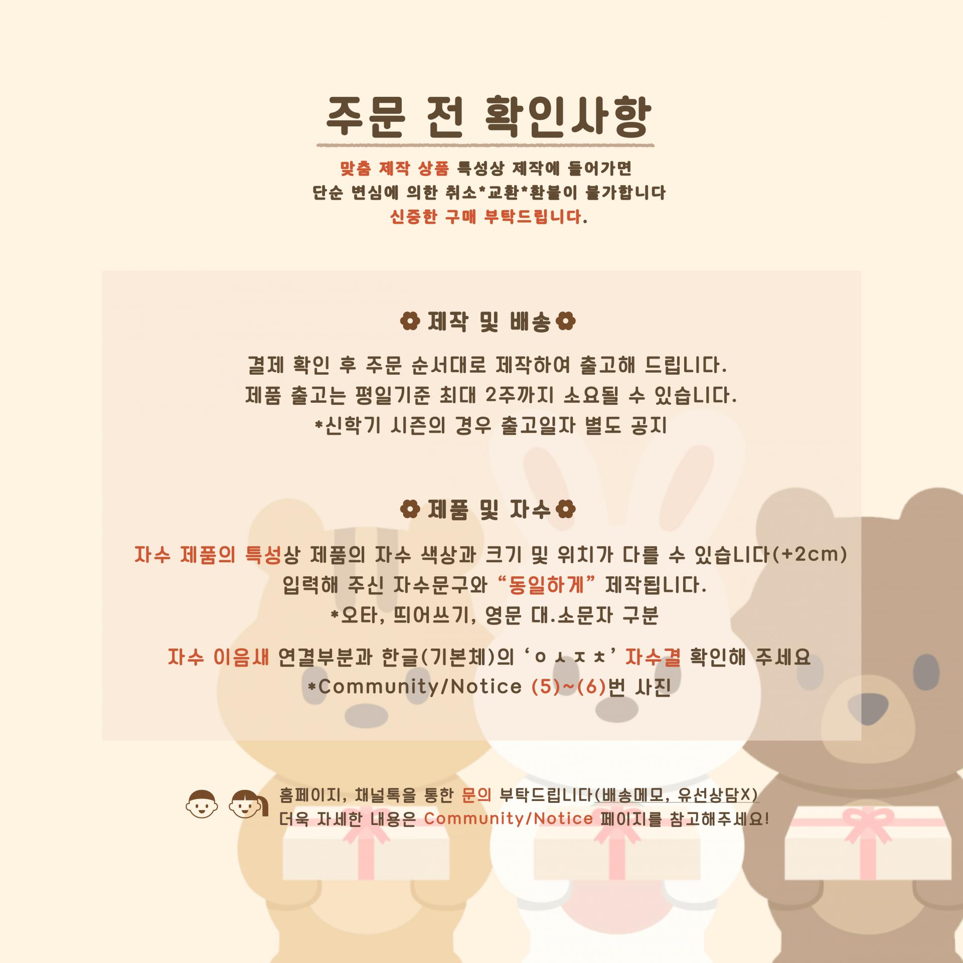 3. 자수 제품의 특성상 자수의 크기, 위치가 다를 수 있습니다. (+-2cm)
